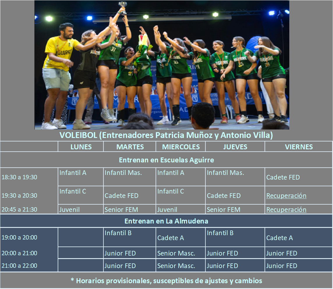 - EL DEPORTE: Club Aguirre os ofrece formar parte de nuestro equipo de Voleibol, por ser un deporte que ofrece múltiples beneficios a los jóvenes. Disponemos de instalaciones adecuadas y tenemos una cantera de niños y niñas que en la actualidad están participando en este deporte en las Escuelas Aguirre.
